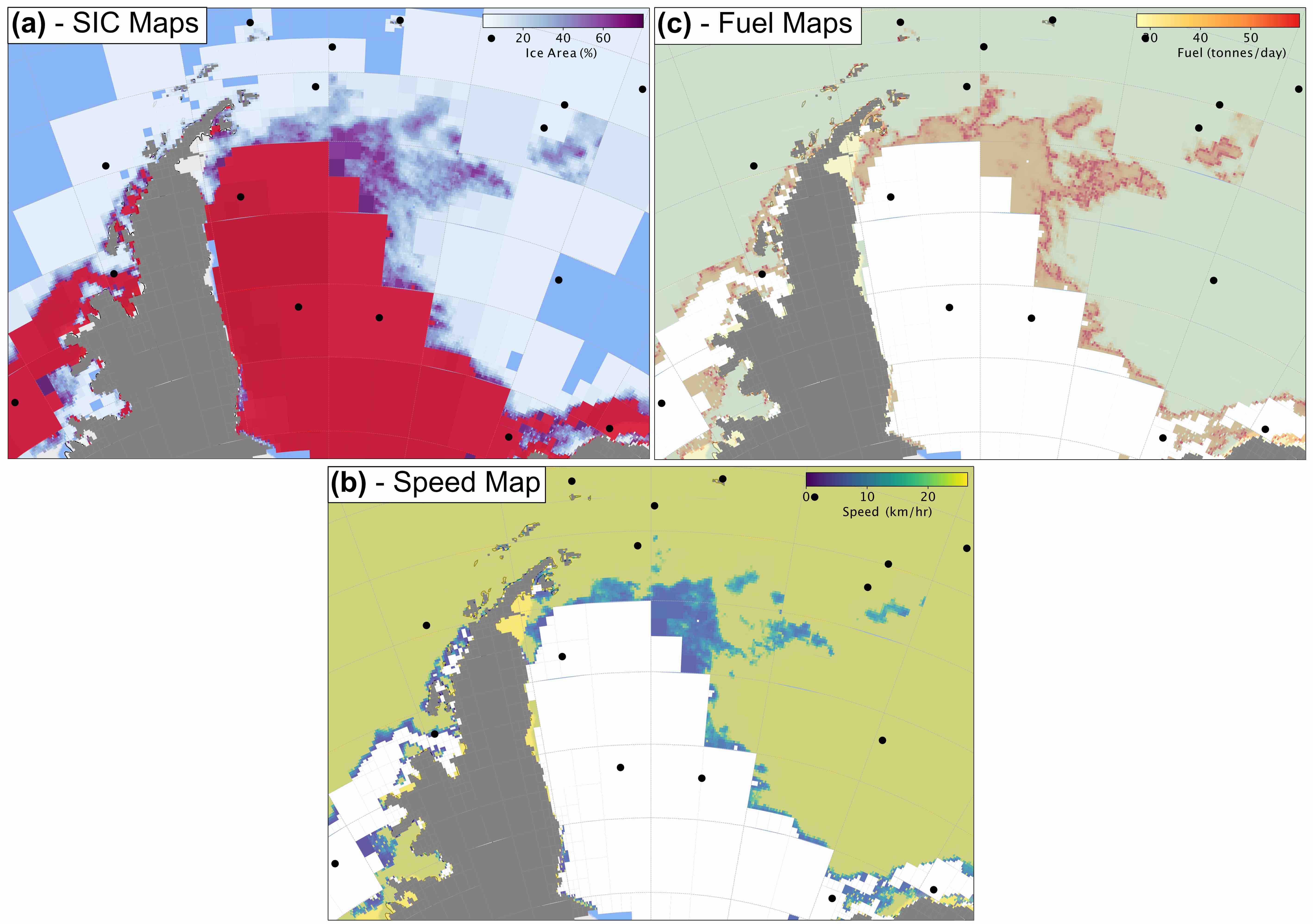 The sea ice concentration (a), speed (b) and fuel consumption (c) for the SDA across the Weddell Sea. The latter two quantities are derived from the former.