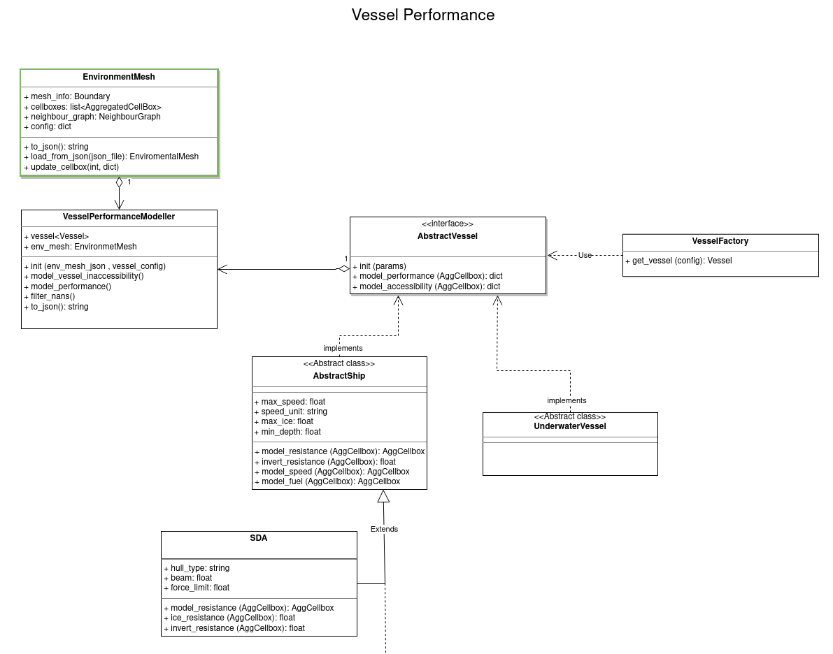 Class for modelling the vessel performance. Takes both an environmental mesh and vessel config as input in json format and modifies the input mesh to include vessel specifics.